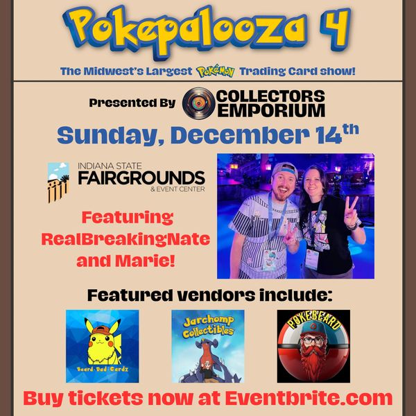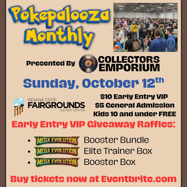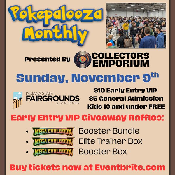 Pokepalooza is now happening every month at the Indiana State Fairgrounds! The october show will feature 115 tables of all Pokemon TCG, merch, and plushies! Over $400 in giveaways to Early Entry VIPs! Get your tickets now!
